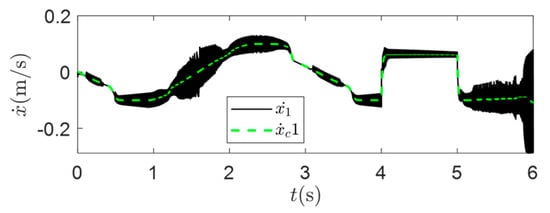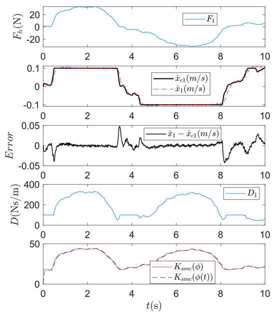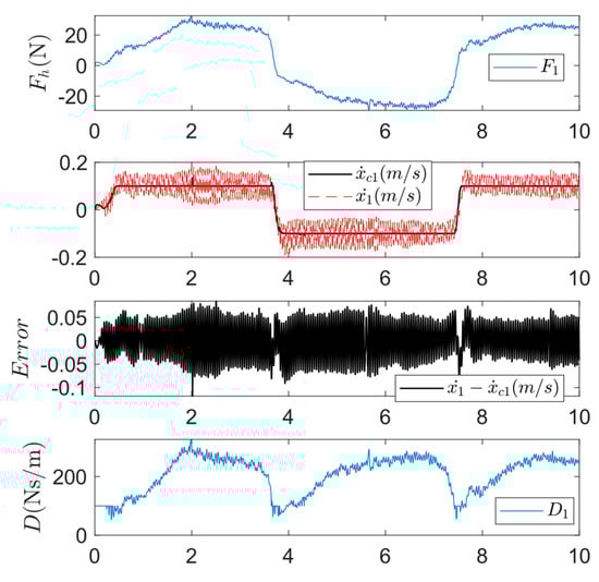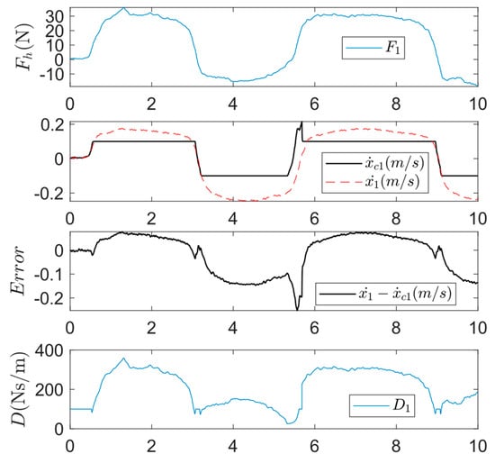 Theoretically, as long as the system states stay on this surface, the desired admittance can be realized via accurate tracking. The sliding surface in Equation (9) was widely adopted in applications of impedance/admittance control [,,]. The prescribed trajectory and stiffness term were included in admittance in these studies. However, we found that applying Equation (9) gives less accurate results in the human-leading scenario where the targeted admittance is expressed as