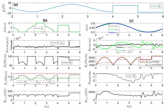 The right side of Equation (24) is exactly the targeted admittance and is always equal to zero. Equation (24) is exactly the targeted admittance and is always equal to zero. It also suggests that Equation (18) is equal to zero with the unique solution, . Thus, it also allows satisfaction of the second goal: tracking desired admittance response. That being the case, Equation (22) can be defined as an equivalent acceleration signal: