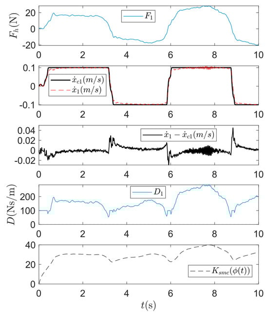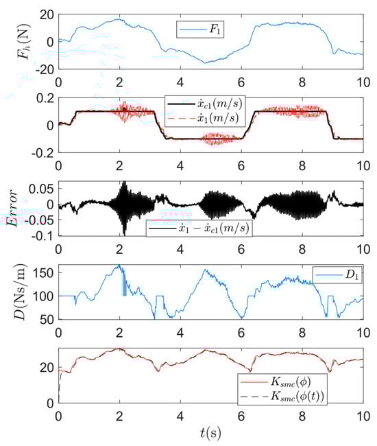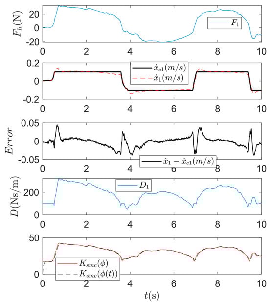where the precise tracking is assumed, i.e., . As mentioned, represents the desired robot response upon human physical interaction. The primary objective of the SMC is to ensure that the robot’s actual response aligns with this desired response. In this context, the assumption facilitates the derivation of a sliding surface and the corresponding control law to achieve this control objective.