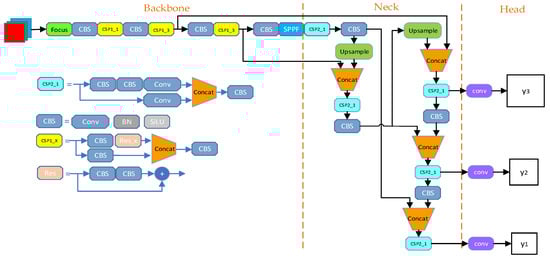 The network structure of YOLOv5s is shown in Figure 1, consisting of a Backbone network, Neck section and Head section. The Backbone network is mainly composed of Conv+BN+SiLu (CBS) and Cross-Stage Partial (CSP) modules. The CBS module includes convolutional layers, batch standardization and SiLU activation functions. The CSP module divides the feature map into two parts, allowing its gradient flow to propagate through different paths, and then obtains richer gradient fusion information through feature fusion. The Neck section can obtain strong semantic and localization information from feature maps. After extracting features from the input image through Backbone and Neck networks, three feature maps of different sizes are the outputs of the Head section to predict the targets of different sizes.