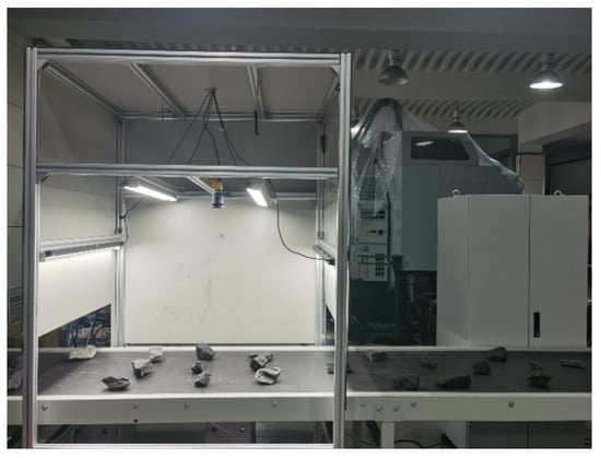 The visual system experimental platform consisted of four strip light sources, an industrial camera, a lens and a sunshade. The industrial camera model was Haikang MV-CA050-20UC, as shown in Figure 6. We placed coal and coal gangue samples on a conveyor belt, collected and identified images in a dark box and then transmitted the classification information of coal and coal gangue as well as the coordinate information of coal gangue to the robotic arm. The robotic arm synchronously tracked the coal gangue target, and finally grasped it. The experimental software and hardware environment is shown in Table 1.