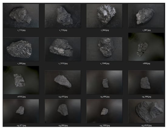 In order to meet the actual working conditions, the conveyor belt and the light source system were built in the laboratory, and the coal and coal gangue image data on the conveyor belt were collected using an industrial camera in a dark box. After screening and data enhancement, a total of 14,790 coal and coal gangue image datasets were obtained. The datasets were divided into training set, validation set and test set according to the ratio of 8:1:1. The dataset images are shown in Figure 7, labeling the image of the coal block with c_x and the image of the coal gangue with cg_x.