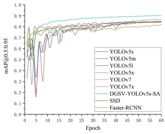 To further validate the effectiveness of the proposed method in this paper, a comparison was made with YOLOv5s, YOLOv5m, YOLOv5l, YOLOv5x, YOLOv7, YOLOv7x, SSD and Faster-RCNN [25,26,27]. The experimental parameters were uniformly set, with a training batch size of 16 and training period epoch of 60, and the validation set precision curve is shown in Figure 9. As can be seen from the figure, compared with other networks, DGSV-YOLOv5s-SA shows better performance under the same training period.
