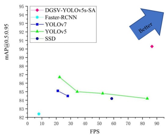 The evaluation metrics of the experimental results were compared, as shown in Table 2. Compared with Yolov5s, YOLOV5m, YOLOV5l, YOLOv5x, Yolov7, YOLOv7x, SSD and Faster-RCNN, the mAP value of DGSV-YOLOv5s-SA increased by 6.1%, 5.5%, 5.3%, 3.6%, 5.8%, 5.2%, 6.1% and 7.9%, respectively. In addition, inference speed, recall rate and F1 value in the test set were also significantly improved.