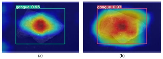 In order to further explore the training process of the neural network and observe the effect of the improved module more intuitively, the Grad-CAM [28] heat map algorithm was used for the visualization of the algorithm’s feature map. As can be seen in Figure 11, the improved network model pays more attention to the global features and increases the receptive field; at the same time, irrelevant information about the background is suppressed. Moreover, the feature extraction is more comprehensive, which in turn improves the precision of coal gangue target detection.