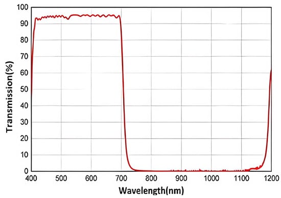 During the experiment, we employed four 850 nm LED chips as light sources, each with an optical power of 60 mW. We connected them in parallel to a 3.3 V power supply and measured a working current of 50 mA. These four LED chips were embedded into a 5 × 5 cm acrylic light-guide plate to generate uniform near-infrared light. To capture the images, we utilized a near-infrared camera module manufactured by LRCP Luoke (produced in Shenzhen, China), with the model designation V1080P_PCBA. This camera boasts a maximum resolution of 1920 × 1080 pixels, as detailed in Table 1. In the process of capturing images, we set the image size to 192 × 192 pixels based on the proportion of the hand’s area within the camera’s captured frame. With regard to the projection module, we utilized a miniature projector with the model name “m100smart,” manufactured by Vmai (produced in Shenzhen, China). This device achieved wireless connectivity with the image processing module via Parsec (150-89d) software, and the specific parameters can be viewed in Table 2. The image processing module was configured with an AMD Ryzen 7 5800H and 16 GB of RAM to ensure high performance. We used a hot mirror with an incidence angle of 45°, which had a strong reflection ability for near-infrared light, with wavelengths ranging from 750 nm to 1200 nm. Additionally, this mirror allowed the light outside of this range to pass through directly. The transmission rate and light wavelength relationship can be seen in Figure 2. To ensure stability and precision, we fixed the camera and hot mirror within a 3D-printed box.