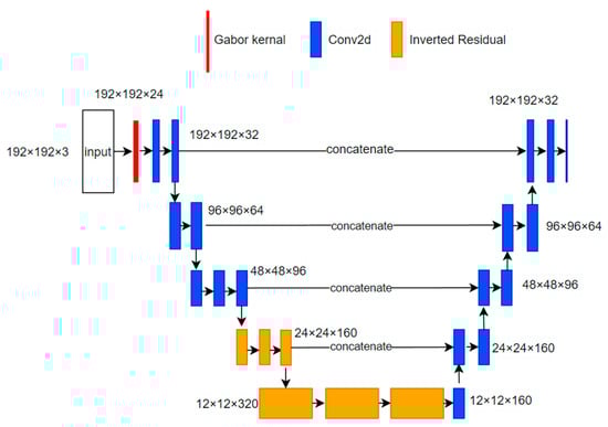 The acquired image is subjected to binarization segmentation in the image processing module. We embedded prior knowledge into the segmentation network, fully utilizing the texture enhancement effect of Gabor filtering [26] to bolster the features in the shallow network. Specifically, we employ the U-Net for the segmentation network, which incorporates the multi-directional and multi-scale Gabor filter parameters into the encoder’s shallow convolution kernels. This integration is shown in the red section of the network model depicted in Figure 3. After adjusting the overall channel number of the downsampling network, the convolutional operations are substituted with inverted residual blocks to minimize the semantic information loss, as depicted by the yellow segment of the network model. The improved U-Net’s structure is shown in Figure 3.