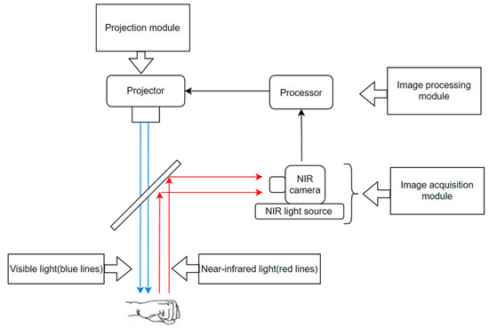 To validate the improved algorithms, this we devised a vein projection system composed of the following three modules: an image acquisition module, an image processing module, and a projection module. In the image acquisition module, we designed a uniformly distributed near-infrared (NIR) light source by using a light-guide plate. This design effectively reduces the impact of reflected flares on the images. The captured near-infrared images are transmitted to the image processing module, where they are enhanced and segmented by the improved U-Net algorithm. Finally, the light path of the projector and the NIR camera are corrected to be coaxial. Even if there is an error in the installation process that causes the light path of the two to be not completely coaxial, the projected image can also be adjusted to coincide with the real object through a homography matrix. Figure 1 depicts the physical components of the vein projector and illustrates each module in detail.