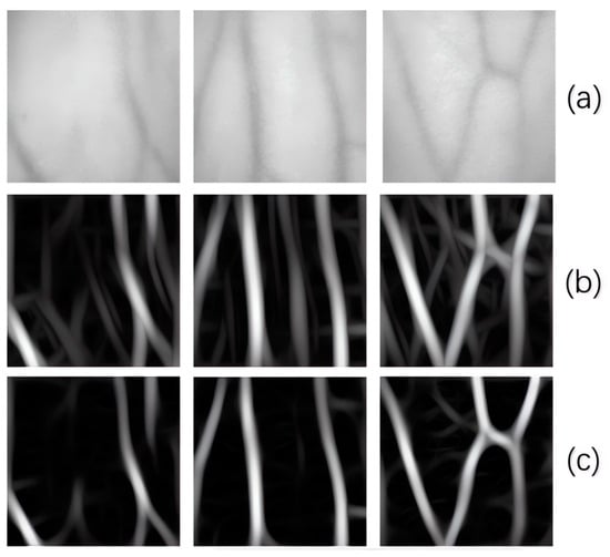 In this paper, we embedded fixed-parameter Gabor filters into shallow networks to enhance image features. This approach effectively alleviates the problem of semantic recognition difficulty in deep networks caused by insufficiently extracted features from shallow networks. Usually, ψ and γ are fixed at 0 and 1, respectively. To make a filter closest to that of an animal’s vision system, the half-response spatial frequency bandwidth is usually set to 1. The value of λ is determined by the width of the veins in the image [36] and can be used to calculate the value of σ. Based on the vein features in the image, we created three different scales and eight different orientations of filters. By removing the DC component in the filter, the impact of lighting and image gray distribution is reduced, resulting in a frequency and directional visual representation closer to that of human perception. In order to better observe the results, we applied Gabor filters both with and without DC components to process the near-infrared images of the dorsal hand. The original image and the filtered images both with and without DC components are shown in Figure 8. It can be observed that the input image has better results after the Gabor filtering process without the DC component.