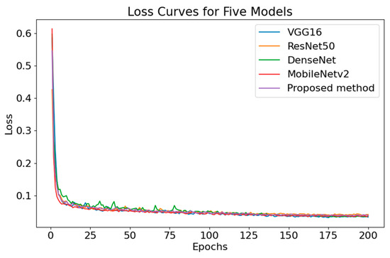 In order to assess the performance of the improved network, comparative experiments were carried out using VGG16, Res-UNet, Dense-UNet, MobileNetv2 [37], and the proposed approach. Before conducting the experiment, a total of 108 dorsal hand vein images were collected, and, after simple data augmentation, they were divided into 432 training samples, 54 validation samples, and 54 test samples. The model was trained with a batch size of 4 for 200 epochs, and the loss functions for each model are shown in Figure 10. After training completion, the test dataset was fed into the neural network for segmentation. Each network model was trained five times. The average accuracy, size, and time taken for image segmentation by the different networks were recorded, as shown in Table 4.