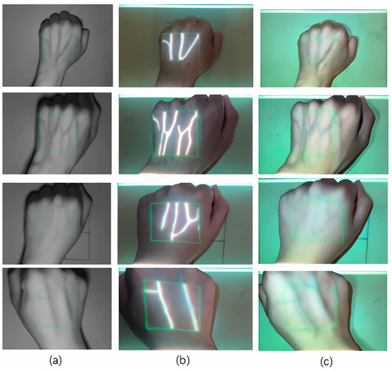 - Dai, X.; Zhou, Y.; Hu, X.; Liu, M.; Zhu, X.; Wu, Z. A fast vein display device based on the camera-projector system. In Proceedings of the 2013 IEEE International Conference on Imaging Systems and Techniques (IST), Beijing, China, 22–23 October 2013. [Google Scholar]