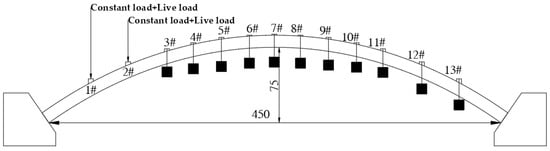 Based on the scaled-down calculations, the dead load compensation for the self-weight of the arch rib and the converted dead load from the structure atop the arch are detailed in Table 1. These loads are applied at loading points 1# to 13#. According to the research objectives in the literature [], the reason for selecting #1 and #2 columns as loading points is to analyze the structural forces at the foot of the arch for the maximum bending moment condition. Consequently, the test live load is specifically applied at points 1# and 2#. Positions 3#~13# have dead loads applied by counterweights, while positions 1# and 2# both use jacks to apply dead loads and live loads. A schematic representation of the loading arrangement is displayed in Figure 1. Arch rib section is displayed in Figure 2.