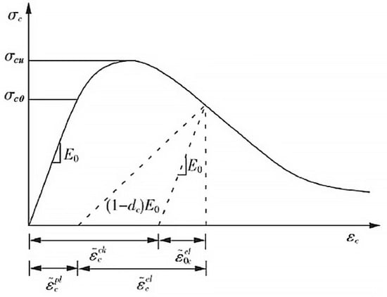 Among them, is the standard value of uniaxial compressive strength; is the corresponding strain value, and the recommended calculation formula is ; and are the parameter values of the descending section of uniaxial tensile and compressive stress–strain curves, respectively, and the corresponding values are shown in the specification.