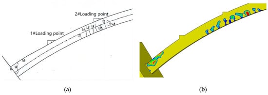 Using preset parameters and experimental loads, horizontal and vertical displacement data for Column 2 were extracted from the referenced literature and were compared with our simulation model. The horizontal coordinates in Figure 7 are the live load multipliers, and the load values are shown in Table 2. The vertical coordinates are the displacement values. The displacement values are shown in Figures 3.4.5-3 and 3.4.5-4 in the literature []. As shown in Figure 7, the simulation results largely followed a linear trend without prominent deviations from the experimental data. The most significant discrepancy in horizontal displacement emerged in Load Cases 6 to 9, with a peak difference of 0.95 mm. Meanwhile, the greatest variance in vertical displacement appeared in Load Cases 4 to 6, peaking at 0.7 mm. Given potential inaccuracies in the simulation parameters, measurements, and loading, these deviations are within acceptable limits. Moreover, the damage distribution depicted in Figure 8 for the left half-span aligns closely with the experimental model, underscoring the reliability of our simulation results.
