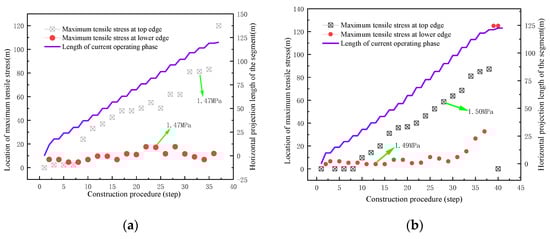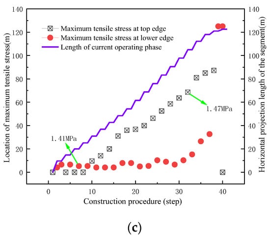 Before conducting the analysis, it is essential to assess the arch ring stress variation throughout the construction phase and pinpoint potentially vulnerable cross-sections. Three cast-in-place arch bridges were selected for comparison: Shatuo Bridge (with a span of 240 m), Qingshui River Bridge (with a span of 248 m), and Xixiu Bridge (with a span of 288 m). The stress changes during the construction of the three bridges are shown in Figure 9. The data suggested that as the length of the constructed segments increased, the peak stress on the upper edge progressively relocated towards the crown of the arch. Notably, most bridges manifested significant tensile stress concentrations at this crown. Conversely, while stress variations were evident at the lower edge near the abutment, they predominantly clustered in its vicinity. These findings underscored the arch crown as a pivotal transition point during construction. Before commencing construction at the crown segment, primary damage locations were predominantly at the base plate of abutments. However, after this phase, these points shifted closer to the top plate of the crown.
