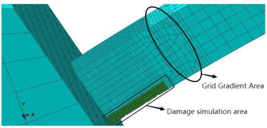 The protective layer of the arch rib has a thickness of 10 mm. Considering the potential full-layer damage, a 16 mm concrete thickness was designated for the simulation. The element size was set at 4 mm and a 12 mm thickness was earmarked for element removal, excluding elements proximate to the contact surface from damage consideration. The damage zone was an independent mesh component seamlessly integrated with the arch rib. To optimize computational efficiency, the mesh was meticulously segmented within the arch rib’s damage simulation zone, progressively increasing the mesh size through a transitional area.