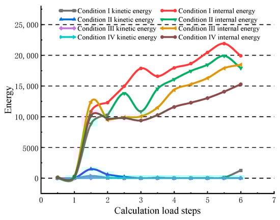 Given the 12 models formulated in this research, those at identical locations only vary in damage rates. A model exhibiting a 10% damage rate was chosen as a representative sample. Extracting internal and kinetic energy data from select load steps yielded the curve depicted in Figure 11. The data underscore that the kinetic energy in all models is significantly below the internal energy, contributing less than 10%, thus meeting the quasi-static analysis criteria [].