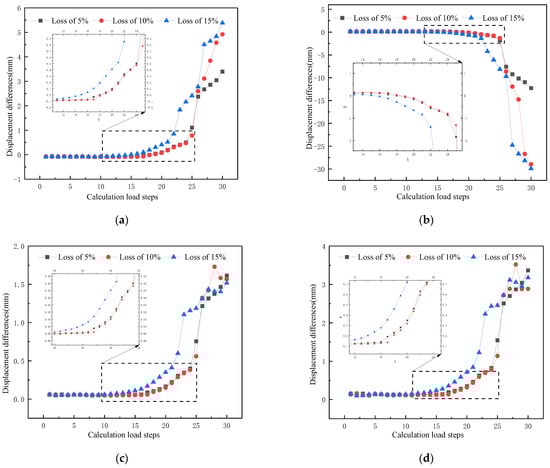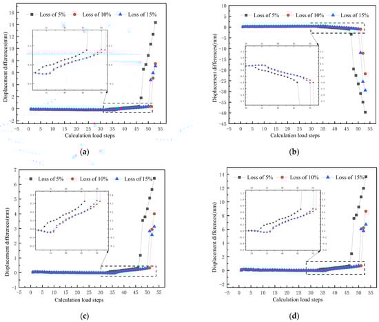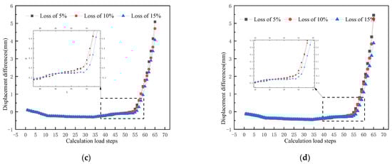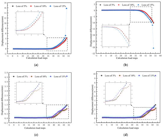 For a clearer visual representation of the displacement alterations, the 2# and 11# bearing pads (situated at the loading point and close to the hance, respectively) were chosen as data extraction points for displacement, based on prior experimental results. In the following section, the displacement results for different damage conditions are summarized. It is shown in Figure 12, Figure 13, Figure 14 and Figure 15. In each figure, (a) represents the X-direction displacement at position 2#, (b) represents the Y-direction displacement at position 2#, (c) represents the X-direction displacement at position 11#, and (d) represents the Y-direction displacement at position 11#. The horizontal axis indicates the load steps, while the vertical axis illustrates the displacement variance pre- and post-damage.