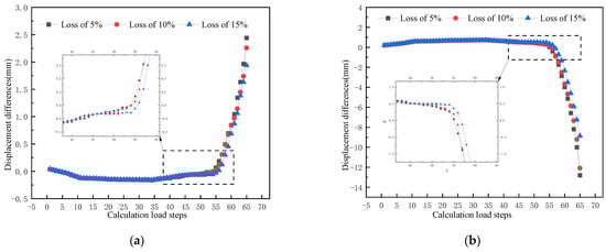 Figure 12 illustrates the displacement alterations following damage to the bottom slab of the springing. The data curve trends were largely consistent. In the initial 30 load steps, the impact of displacement damage was marginal, suggesting the stability of the arch structure. Post the 30th step, a slight elevation in displacement disparity occurred, culminating in a pronounced increase that signified structural collapse. This suggested that the damage rate of the bottom slab does not directly influence the onset of structural failure. The marked surge indicated that damage expedited the structure’s brittle breakdown. Intriguingly, under a 5% damage rate, the displacement variance was more pronounced than the 10% and 15% rates and structural failure manifested sooner. This challenged the prevailing belief that “greater damage equates to a higher likelihood of failure”.