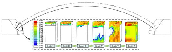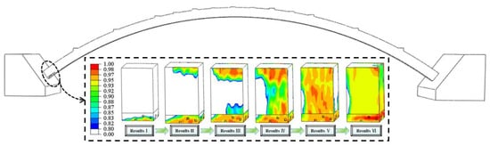 Within the ABAQUS 2022 finite element software, the rate of stiffness reduction in SDGE serves as an indicator to ascertain an element’s failure. In the figure legend, 0 denotes an unimpaired element with no loss in stiffness, while 1 implies total stiffness degradation, signifying material failure. For this study, a model with a 5% damage rate was chosen to examine the progression and spatial distribution of element damage and to shed light on how damage evolves in the arch ribs under varying operational conditions. According to the calculation of different damage conditions, the results of the local damage distribution mutation stage are extracted and divided into Results I~VI and Results I~V in turn.