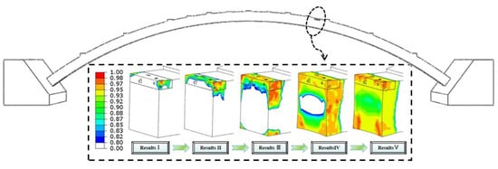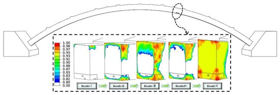 Figure 16 and Figure 17 depict the stiffness alterations in elements following damage to the top and bottom slabs of the arch foot, respectively. From the results in Figure 16 (Results I and II), it was observed that the damage to the arch foot top slab first started from the corners and then gradually extended to the surface of the web. The degradation on the top surface commenced at the edges, advancing toward the center, culminating in a substantial region of stiffness reduction in the elements. This failure was confined to the surface of the damage zone in the arch rib and showed no effect on the reinforcing steel framework. Results III, IV, and V illustrated that while the concrete protective layer on the top slab sustained damage, its impact on the bottom slab remained insignificant until complete failure ensued. As damage continued to evolve, the deterioration of the bottom slab extended from the web surface upwards to the top slab, with pronounced damage to its protective layer manifesting only after comprehensive failure of the web surface.