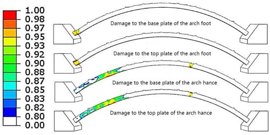 After analyzing the progression of localized damage, a deeper exploration was conducted into the overarching structural implications under varied initial damage conditions. Figure 20 illustrates the aftermath of expansive material failure based on various starting damage points. As depicted by the elemental stiffness failure distribution in the figure, distinct initial damage sites at the arch foot exhibited no influence on the global structural damage distribution; predominant failure consistently stemmed from damage originating at the arch foot. Conversely, when the initial damage was positioned at the arch hance, pronounced damage was evident mainly at the arch hance and the vicinity of the 2# pad beam. In this scenario, the arch foot was not the primary locus of failure. Interestingly, when comparing the initial damage on the bottom slab of the arch hance with that on the top slab, the latter proved more deleterious to the integrity of the structure. Given the loading dynamics of the 1# and 2# pad beams, a negative bending moment materialized at the 10# pad beam, resulting in tensile stress on the top slab and compressive stress on the bottom slab. Taking into the low tensile strength of concrete and the initial damage of the material, the structure underwent significant detrimental effects.