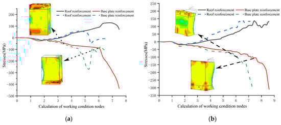 Stress curves of main reinforcement at damage location: (a) damage to the foot of the arch; (b) arch lumbar injuries.