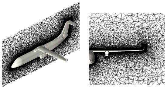 In the present work, three-dimensional CFD computations were conducted to predict the mean turbulent flow around the aircraft model that was provided by the industrial researchers. The simplified aircraft geometry, which is depicted in Figure 1, contained the horizontal and vertical tails as well as the engine nacelle. The model has a length of m, a height of m, and a span of m. The clean configuration of the aircraft was considered, with no high-lift surfaces deployed, while not modelling the effect of the propellers. The calculations were performed for a freestream velocity of 68 m/s, with the Mach and Reynolds numbers corresponding to and , respectively, where the mean aerodynamic chord (MAC) was used as a reference length [26].
