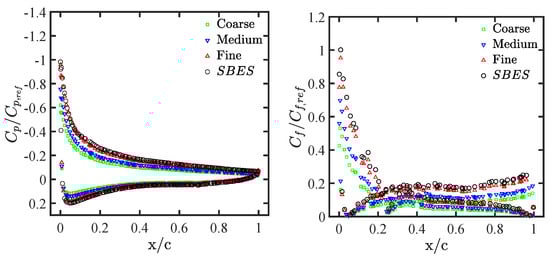Normalized sectional pressure (left) and skin-friction (right) coefficients at , for , and varying mesh resolution compared to SBES.