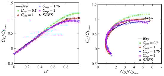 The numerical predictions of the global aerodynamic loading on the aircraft model, for varying coefficients, are reported in Figure 6, in terms of lift curve and drag polar, compared to WT data [26]. Here, the lift and drag coefficients are normalized by the experimental values of and , respectively, while the angle of incidence is normalized as . To perform a systematic analysis, four different calculations were carried out for each incidence by selecting different values for the coefficient in the recommended range, namely , 1, , and 2 (see Table 1). Moreover, a few (costly) SBES solutions were obtained for the stall regime, namely for , demonstrating the conformity between the present SRS results and experimental data.