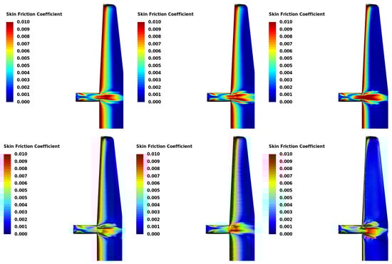 First, let us note that due to the three-dimensional character of the wing BL, the choice of also influenced the spanwise behavior of the aerodynamic loading. This is clearly illustrated, for instance, by looking at the contours of the skin-friction coefficient on the suction-side of the main wing, which are depicted in Figure 7, for the three different incidences and two different values of .