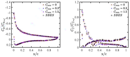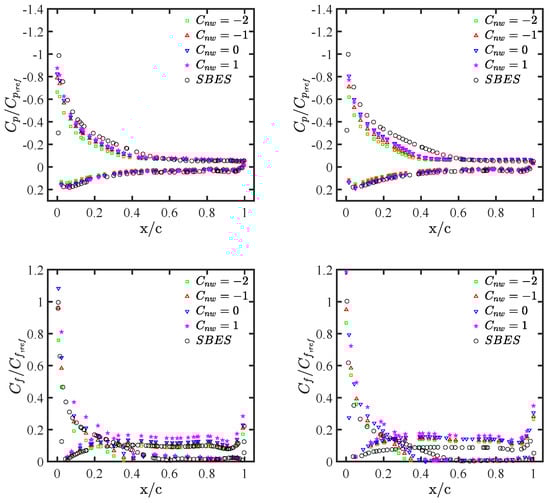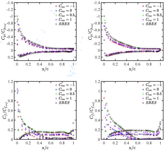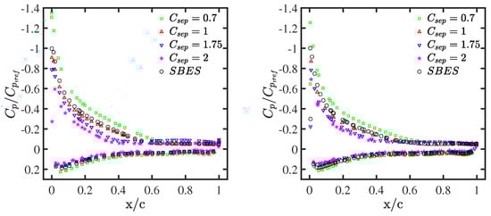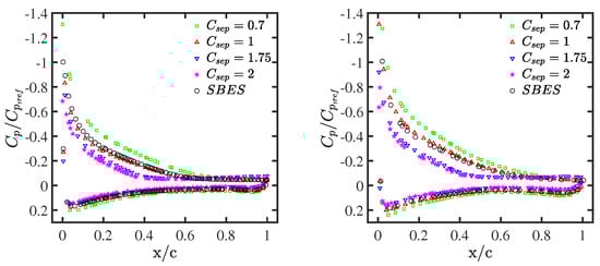 However, in order to determine whether the previous conclusion about the optimal choice of was affected by the prescribed coefficient, a further analysis was conducted by setting at the suggested default value—that is, —while varying . By looking at the sectional pressure and skin-friction coefficient distributions drawn in Figure 14, the choice of the default value for turns out not to be optimal regardless of the level.