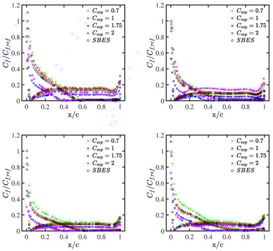 Normalized sectional skin-friction coefficient at (top left), (top right), (bottom left), and (bottom right) for different values of compared to SBES.