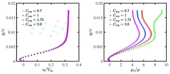 By inspection of these figures, the higher levels of (say ) provide completely wrong or anticipated BL separations. Apparently, decreasing leads to more accurate predictions of pressure recovery regions while approaching the reference SBES solution. This is particularly evident for the wing sections where the BL separation is more important. For instance, Figure 11 shows the velocity profile at and , normalized by the freestream velocity , along with the profile of the turbulent viscosity ratio that is . While the BL velocity field is practically not affected by the variation of , the modeled eddy-viscosity increases with decreasing this parameter, leading to less sensitivity of the BL flows to the high adverse pressure gradients on the suction-side of the wing. Therefore, the separation onset is more correctly represented by the lowest levels of this parameter. However, for , the eddy-viscosity was overly increased, and the accuracy of the solution was lost, with both pressure and skin-friction coefficients being overestimated. On the contrary, by increasing too much this parameter, the BL separation is anticipated, and the separated flow region is erroneously enlarged. This is particularly evident by looking at the skin-friction coefficient plots, where determines the separated flow zone. Overall, the prescription of resulted in being the optimal choice for the present aeronautical application (when keeping the other coefficients unchanged).
