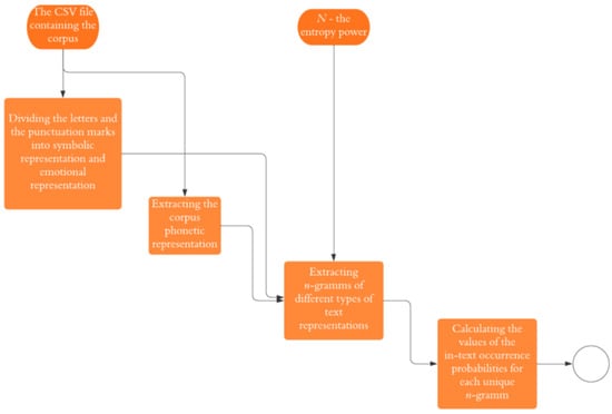 The output data of the application included nine CSV format files: this included the values of the probability of occurrence of n-grams in the text, phonetic transcription and punctuation marks, where n ∈ {1, 2, 3}, given that in this work only the entropy values of the 1st, 2nd and 3rd orders were analyzed.