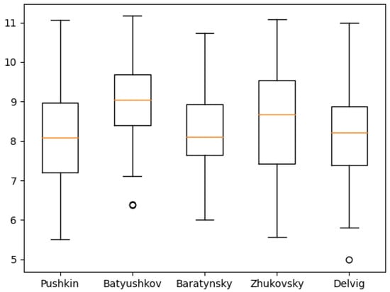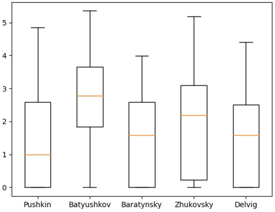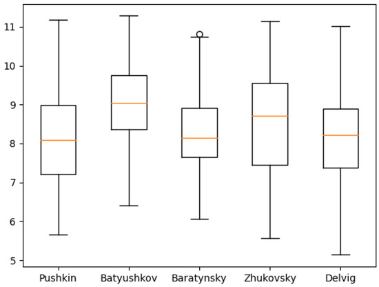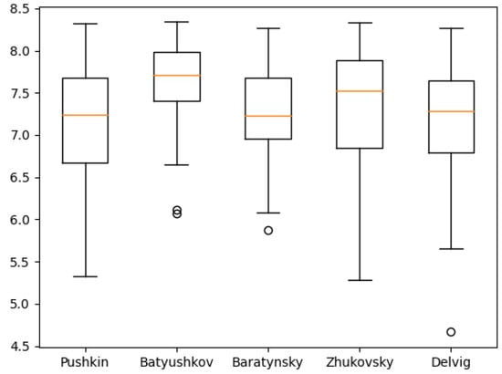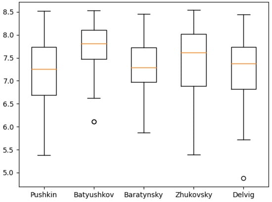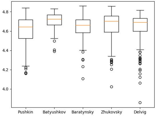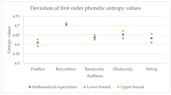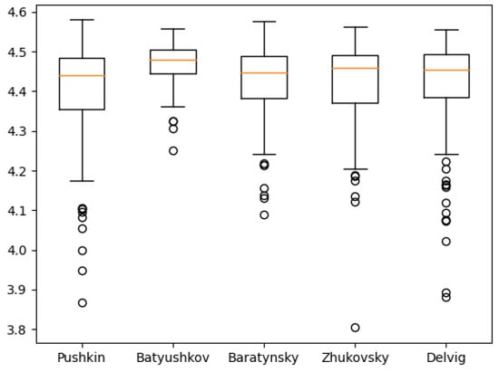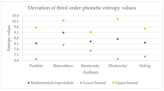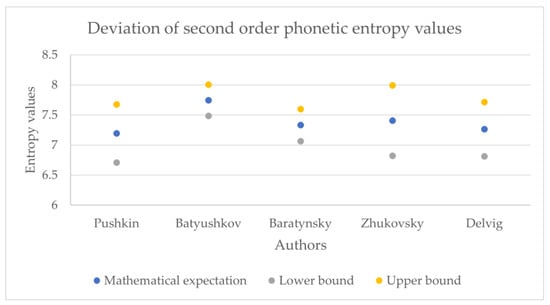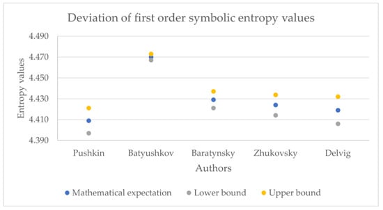 However, these values may also offer a deeper understanding of authors who are more exact in the textual representations of their work, like Pushkin, and who are less exact, like Batyushkov. In particular, it can be noted that the symbolic and phonetic entropy of the 1st and 2nd order of Batyushkov’s works had a much smaller standard deviation value than the same entropy of other authors. This was an unexpected result compared with other authors despite being in good agreement with the characteristics of his work described in the Big Russian Encyclopedia [19]: “The musical harmony of verse, created by numerous alliterations and gaping, combined with the refinement of the poetry form, is the characteristic sign of the Batyushkov’s style”. From these values, it can be seen that the strictness of the poetic form provides a relatively small spread of entropy values.
