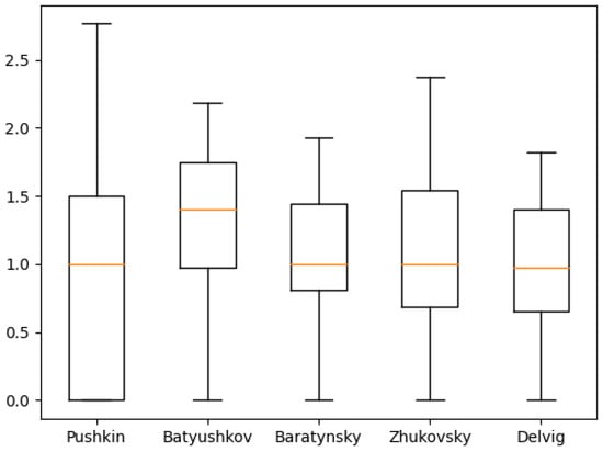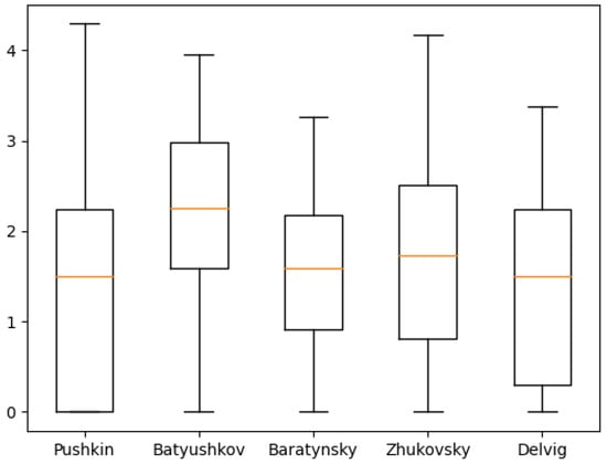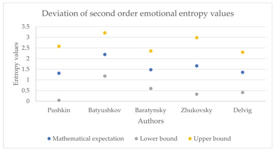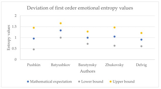 Another unexpected result is the relatively small value of the lower quartile of the 1st and 2nd order of emotional entropy in Pushkin’s works. Despite being unexpected due to the overall perception of Pushkin’s works as emotional, similar results were obtained in the study of his works using machine learning methods: “Pushkin, unlike other authors, preferred the usage of dots and ellipses rather than exclamation marks, which differs him from the other authors. Additionally, according to the study of Pushkin’s word usage, Pushkin was also not inclined to use the interjection «ax»; therefore, it can be noted that the other poets of Pushkin’s era were much more emotional and wrote with a more pronounced enthusiastic syllable” [20].