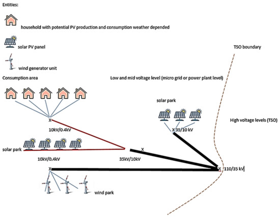 Out of these desired outcomes, particular attention needs to be paid when selecting areas of the system that must be modeled down to the lowest level entities, such as the individual households or singled out production units in the power plants. Figure 1 gives an insight into the required level of modeling of all participants in the energy market.