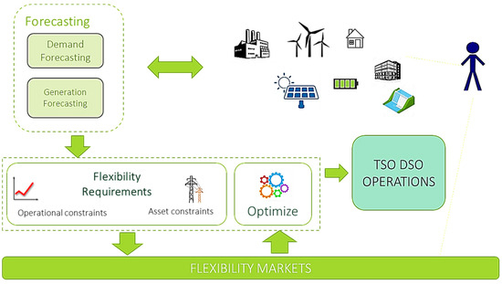 In order to help facilitate the energy transition, the EU finances projects that aim to provide a solution to the flexibility challenge. These energy projects each contribute in a different way to enabling the energy transition, from system management to risk mitigation and interoperability fostering. A scalable and interoperable energy management system will be implemented as part of the four-year COLLECTiEF project [25], which aims to turn buildings into smart habitats. COLLECTiEF increases flexibility on both the supply and demand sides to perform this. The EUniversal project [26] attempts to create strategies for the effective implementation of an interoperable flexibility ecosystem throughout Europe. It serves as a basis for the development of new services, market solutions, and the implementation of practical procedures to support consumers, prosumers, and energy communities in actively participating in the energy transition. This new strategy will concentrate on how DSOs employ flexibility and interact with markets.