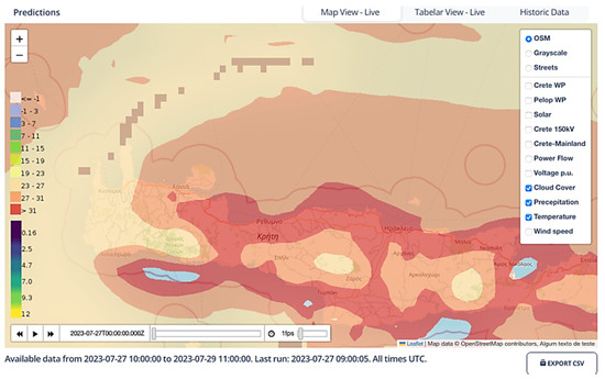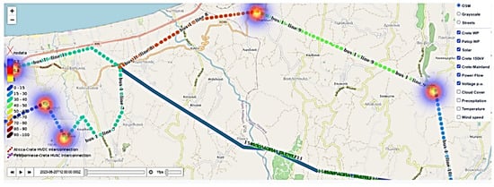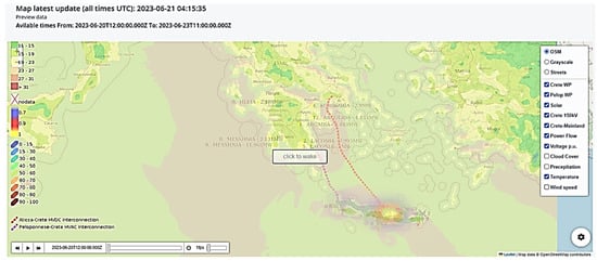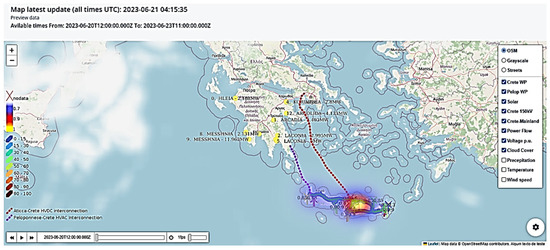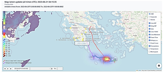 The visibility of the electricity cables and grid nodes in Figure 5, even if the temperature characteristic was chosen to be shown there, accurately implies that the user can have simultaneous access to the grid and weather layers of the Forecasting module, enabling them to draw some inferences or identify correlations that might otherwise go unnoticed. In Figure 6, the weather layer of the F-channel platform is shown, with cloud coverage chosen as the meteorological characteristic of interest rather than temperature.