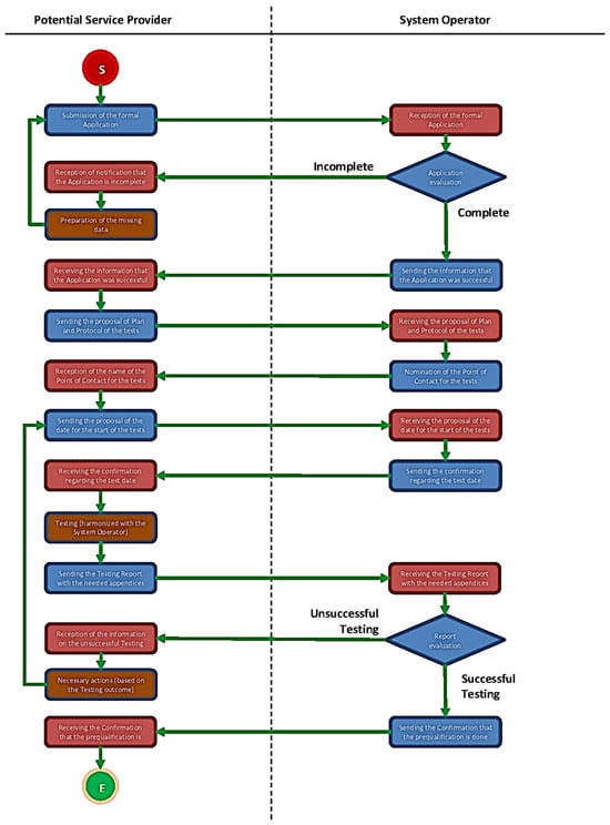 As already discussed, the prequalification process, in simplified terms, ensures that the potential flexibility service provider (FSP) can supply the system with the needed resources, based on the appropriate auction. This process is performed for the first time when the provider initially appears in the energy market for the certain product and can be repeated either in regular timeframes or after the specific request of the SOs. The basic flowchart of this process can be found in Figure 9, in which the blue rectangles mark the situations in which the entity (SO or the potential FSP) sends the data to the other entity, and the red rectangles mark the moment in which the data are received by the entity (once again, SO or the potential FSP). Since the dashed line down the middle of this diagram separates the parts of the process that are the responsibility of one entity from the parts that are the responsibility of the other entity, it makes sense that the green arrows crossing this line represent the information exchanges that take place between the two entities within the prequalification procedure.