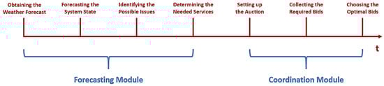 By its definition and the basic idea behind it, the F-channel platform represents an application of a web-based client-server for TSO-DSO coordination, utilizing high-resolution weather forecasting [34], artificial intelligence methods [35,36,37,38], a GUI based on the georeferenced projection of the grid on the map, and cloud calculation engines. The F-channel platform should encompass and implement a set of common functionalities for the SOs regarding the enhancement of forecasting capability and efficiency in various time frames, limiting the volume of flexibility needs [39,40,41] in the process, as well as the identification and prequalification of various flexibility resources willing to purchase grid services [42,43,44] through the “market-to-network” coupling of the alternative solutions. In a simplified way, this type of relationship between the under-investigation process participants is demonstrated in Figure 2, and it involves a Forecasting and a Coordination module. The integration of AI and cloud computing can lead to complex implementation processes. These were taken into consideration, and the allocated computing resources were split into two groups: continuously allocated ones and ones allocated per computation/transaction. This made the implementation processes simpler and the computation time shorter.