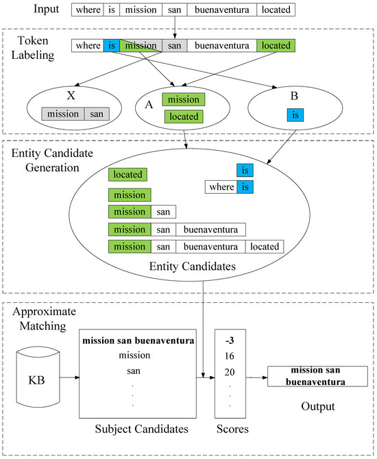 However, sometimes, a set may contain no elements, a wrong element, or more than one element. In this case, all possible entity candidates are generated based on these elements in entity candidate generation. Then, all subject candidates in a KB is scored based on their similarity in approximate matching. The subject with the lowest score would be considered as the best-matched one. For example, the subject candidate “mission san buenaventura” in the KB has the highest similarity to one of the entity candidates (“mission san buenaventura”) with a score of −3.0, so it is considered as the recognized subject. Our model will be described in detailed in the following subsections.