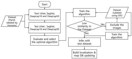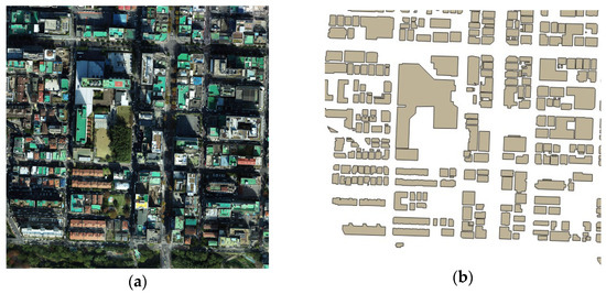 This study underscores the significance of labeling and refining data, leveraging only the building information registered in the GIS (geographic information system). Our approach leans towards active learning, wherein automatically labeled data undergo refinement with minimal human intervention, resulting in a curated labeled training dataset [16]. Often, when delineating specific areas in satellite or drone images, the parcel data from the geographic information system is harnessed, considering any discrepancies or errors [17,18]. Manual labeling, while detailed, is labor-intensive and prone to errors. This necessitates the optimal use of GIS data. At times, discrepancies in images may arise due to inaccuracies in GIS building data or challenges in deciphering image data. In this study, the aim was to enhance the training dataset by gauging network similarity during the refinement phase.