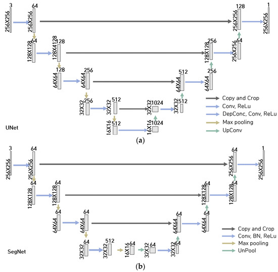 Illustration of neural networks: (a) Unet and (b) SegNet, which both have input dimensions of 256 × 256 × 3 and output dimensions of 256 × 256.