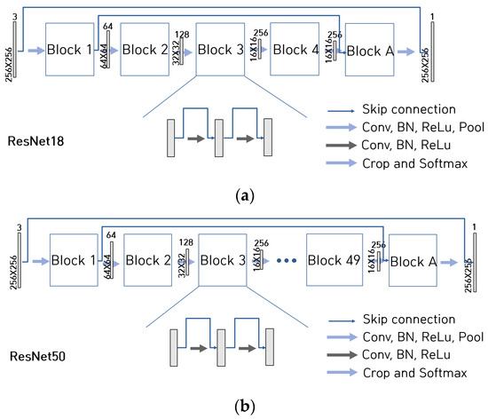 ResNet (a) 18 with input dimensions of 256 × 256 × 3 and (b) 50, where only the input and output structures are modified.