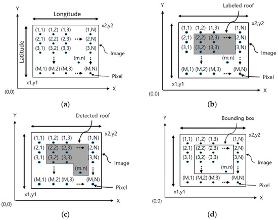 (a) Image matrix used for recognition, (b) ground truth showing labeled pixels, (c) detected roofs inferred by algorithms, and (d) bounding box made by detected pixels.