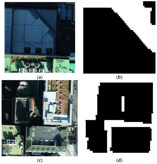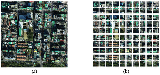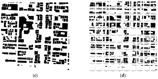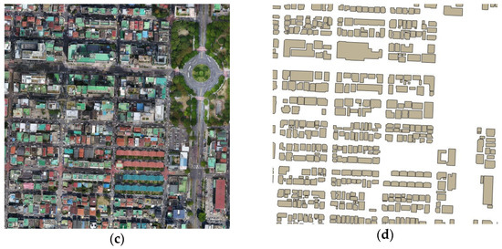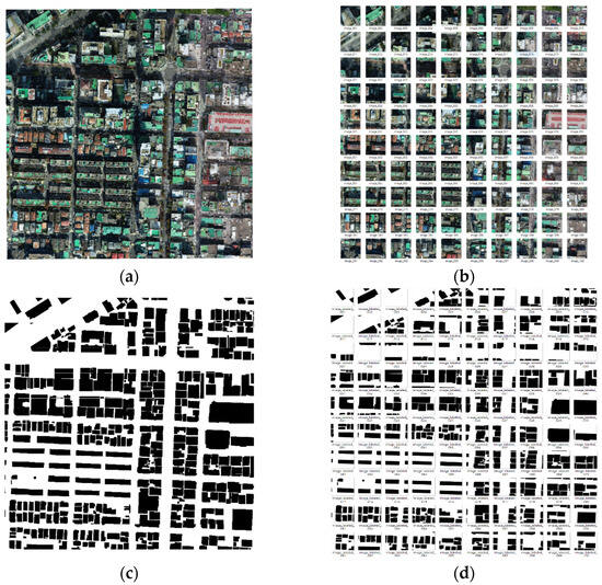 The first procedure was conducted to select the best-performing algorithm. Drone images are typically prepared for this purpose, as shown in Figure 5. Jeju’s urban area has a high concentration of buildings. When using the RTK GPS, the resulting images were highly accurate and large, with a precision of 5 cm. Figure 5a displays the entire region, with an image size of 500 × 500 m2. Figure 5b illustrates the image after it was segmented into 10 × 10 smaller images, resulting in a total of 100 images. In Figure 5c, the map was manually labeled by humans, with only the roofs highlighted in black, which were later categorized under the roof class. Figure 5d shows the corresponding 100 labels for the segmented images. The label images created manually in this manner had two classes: ground and roof. The aim was to find the best-performing algorithm through training and testing without validation, using the same options whenever possible. Therefore, separate validation was not conducted.