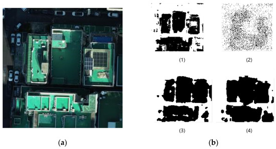 The image labeling process involves assigning a roof or non-roof label to each pixel in the image, as illustrated in Figure 4. The sizes of the input and output images were M = 256 and N = 256, respectively, and they were in RGB format. The labeled images were used to train the network. When a test image is input into a trained network, the network outputs a predicted image showing which pixels are roofs and which are not.