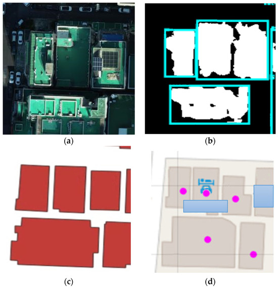 The result is from verifying the registered buildings through the proposed system: (a) a photo taken from a drone, (b) a photo predicting the roof using ResNet50, where the blue square in the image represents the building area, (c) a map showing building information from the geographic information system, and (d) results of marking them on the actual geographic information system with a pink dot indicating buildings confirmed in the ledger.